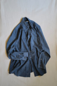 基本少量生産を是とする中野さんは、細かい所までの要望を可能な限り受けてくださる。このシャツには個人的嗜好を思いっきり詰め込むことが出来た。きっと圏外な方には何にも刺さらない摩訶不思議なシャツだろうが、少数派のアルチザン嗜好のある方にはスペシャルなシャツになっただろう。サイズ感について、TシャツもテーラードJKTもレザーBLも基本ジャストが気分だが、シャツは少し感覚が違って大きめに着るのが心地良い今。中に“何か”を着れる余白があることで、季節毎のスタイリングも広がりを見せるはずだ。各部サイズは、未洗い状態で03で着丈84、身幅69、肩幅56、袖丈62.5。04で着丈86、身幅71、肩幅58、袖丈64。僕(177/68)は04を着ています。いつものシャツに比べて着丈はやや長く身幅はだいぶ広い。が、ビスコースは洗うと少し縮みが出る。ANSNAMのアテンションタグとしてはドライクリーニングであり、水に触れることを避けてもらいたいが、僕はレザーBLもスラックスも洗うので、シャツも当然洗います。その場合は、手洗いでお湯は使わないこと、中性洗剤使用、脱水はネットを入れて裏返しにして短めに(ボタンを包むように)、乾燥機は絶対NGです。上記、ミスをすると結構縮むことになると思うので、注意です。あくまで洗濯に関しては、自己責任でお願いします。ANSNAMとのネイチャーシャツ、本当に好きな方に届くことを願います。金曜土曜で(久々に)店を開きます。在庫が残りましたら、日曜正午に商品帖に在庫を移します。