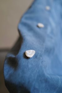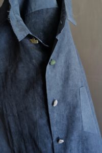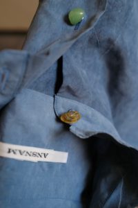 トスカーナで2002年創業のLylia(リリア)のユニーク過ぎる生地。創業者は“日本の侘び寂び”を一つの生地作りのテーマと掲げている。パーツによりグラデーションのように変わる色と染めムラが最大の特徴。デザインはレギュラーカラーの途中とカフスの先をチョップしてもらって、内側の接着芯をあえて見えるように。ボタンはこのナチュラルな生地の流れを組んで、全て天然石にしてもらった。Fade Camelにはユナカイト、Fade Blueにはボツワナアゲートをチョイス。個体差のオンパレードで、特にボツワナアゲートは様々な色があり、全てアソート。当然、石の形状によりボタンホールの通りが良かったり悪かったりするが、そこもこの商品らしさ。山や海がシャツの中に潜り込んだ、ANSNAMのネイチャーシャツが完成した。