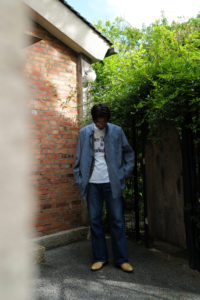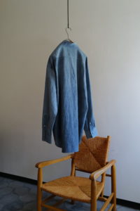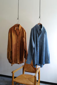ゆるっとしたリラクシーなパターン、自然風化のようなムラ感、ビスコース生地のトロみといった3要素の相性の良さ。Fade Camelはテロテロで落ち感が強く、ナイロン混のFade Blueはややハリもあって適度に形が出る。季節が進めば上質なタートルニットなどの上に羽織れば良いが、中間的なシーズンにはシャツオンシャツも楽しいと思う。生地自体に特異な“味”があるので、下に着るシャツとの質感の差までもスタイリングする上での面白さとなる。