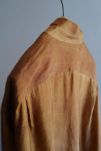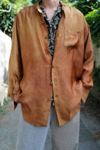ANSNAMと久々に物作りを行う。中野さんは独自路線のオリジナル生地の開発にも積極的だが、ユニークなインポート生地も常にチェックしているデザイナーだ。展示会の最中、欧州の色々な生地スワッチを見せてもらっている中で、これまでに見たことのない印象的な生地に目を奪われてしまった。それが今作で使っているLyliaのビスコースである。天然繊維か化学繊維か、また染料の種類やその方法にもより異なるが、基本的に“染色”は高温で行う。発色良くムラのないように仕上げ、しっかりと定着させることを目的とするからだ。ビスコースは木材パルプを主とした天然由来の再生繊維であり、縮みの心配なども伴うため極端な高温での染めは行わないが、この生地に至っては不均一でムラのあるナチュラルな表情を求めて“コールドダイ”と呼ばれる低温染色をしている。日本人には“不完全な美”に対する潜在的な価値観があると思う。歪んだ飯碗、欠けた木皿、褪色した手織り絨毯。僕自身も不完全なものに特別な感情を抱いてしまうが、見習いの染め職人の失敗作のような“まだら”な染めと、トロみあるビスコースの掛け合わせにまんまとやられてしまった。この生地を用いて、だらっと着れる心地の良いシャツを作ってもらう。