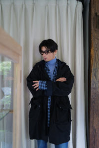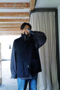 どこかでも書いたことある気がするが、我が家のクローゼットを占めるひとつがシャツであり、その中でも最も数多く所有しているブランドがensou.だ。アイデアと着眼点が他の作り手と全く異なる西川さんの作るシャツは、とにかく面白い。これまで様々なシャツを着てきたと自負しているが、袖を通す時の高揚感が大きく、欠かさず毎シーズンensou.との共作シャツを作ってきた。シャツというアイテムに対して「今、何を着たい?どう着る?」を、半年に1度のensou.との取り組みの中で自問自答し、その時の気分を顕著に反映してきたと思う。今のシャツはどうだ。「ゆるっと着たい」だ。25SSから西川さんは“ビッグラグラン”を冠したシャツを作っておりハナレにも仕入れているが、身幅がかなり広く、袖もとびきり太い。この特徴的なパターンがまさに今の気分だった。変わらず大好きなチェックで生地を探してもらうが、今作ではこれまでのensou.のイメージには無いウールシャツを作ってみる。イタリアの老舗ウールメーカーの作る軽量トロピカルは、ニュージーランド産メリノのSuper120’s。ウールの持つナチュラルなストレッチ性が最大限に引き出され、薄手ながら防シワ性も高く発色も美しい。“ビッグラグラン”の大きなシルエットを打ち消すかのような、ドレープ強めの落ちる素材。寸法上は明らかにビッグだが、横に広がらずに滑りの良いこの素材との組み合わせは、間違いなく相性が良いはずだ。