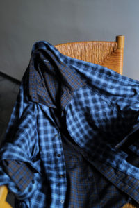 イメージしていた通りビッグサイズ感は打ち消され、大人が楽しめるシャツになった。つるっとして袖通りも抜群なので、トレンチコートのような大きな筒の内側に色々なものが仕舞い込める。ハイゲージニットはもちろん、ミドルゲージも楽勝で、ジャストなGジャンもスポっと袖を通った。これは新しい。僕のようにシャツを豊富に所有している方にこそ、このドレープ感と、このシャツでしか叶わない自由なファッションを楽しんでもらいたい。2色用意しました。Sax Checkはサックスとネイビーの大きめな格子に白のペーン。アメカジチェック的な若々しい雰囲気は、肌艶の無くなってきた大人が着てこそ映える色。寒くなるこれからのシーズン、このチェックがちらっと見えるだけで軽さを出してくれ、色落ちしたデニム、ライトグレーのスラックスなど“冬のライトトーン”とも鉄板の相性です。そしてもう1つは、シックな印象のBlue Brown Check。サックスより暗く、ネイビーより明るいブルー、そこにブラウンが交錯する落ち着いたトーンの細かなチェック。まさに秋冬感のあるウールシャツで、これもデニムには鉄板。ブラウンのトラウザーに合わせたくなりますね。先週リリースしたカシミヤタートルを受注された方、是非合わせてみてください。サイズはMで着丈85、身幅76、裄丈88。Lで着丈87、身幅78、裄丈90。僕(177/68)は、どちらもLを着用。Mも普通に着れますが、袖丈と着丈のバランス的に僕はLの方が良かったです。金土の店頭発売。在庫が残れば日曜正午に商品帖を更新します。