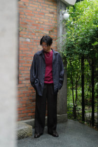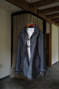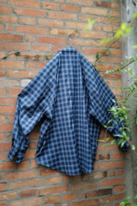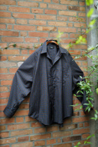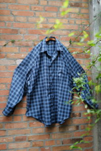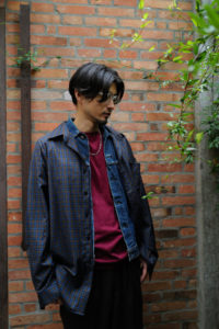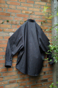 どこかでも書いたことある気がするが、我が家のクローゼットを占めるひとつがシャツであり、その中でも最も数多く所有しているブランドがensou.だ。アイデアと着眼点が他の作り手と全く異なる西川さんの作るシャツは、とにかく面白い。これまで様々なシャツを着てきたと自負しているが、袖を通す時の高揚感が大きく、欠かさず毎シーズンensou.との共作シャツを作ってきた。シャツというアイテムに対して「今、何を着たい?どう着る?」を、半年に1度のensou.との取り組みの中で自問自答し、その時の気分を顕著に反映してきたと思う。今のシャツはどうだ。「ゆるっと着たい」だ。25SSから西川さんは“ビッグラグラン”を冠したシャツを作っておりハナレにも仕入れているが、身幅がかなり広く、袖もとびきり太い。この特徴的なパターンがまさに今の気分だった。変わらず大好きなチェックで生地を探してもらうが、今作ではこれまでのensou.のイメージには無いウールシャツを作ってみる。イタリアの老舗ウールメーカーの作る軽量トロピカルは、ニュージーランド産メリノのSuper120’s。ウールの持つナチュラルなストレッチ性が最大限に引き出され、薄手ながら防シワ性も高く発色も美しい。“ビッグラグラン”の大きなシルエットを打ち消すかのような、ドレープ強めの落ちる素材。寸法上は明らかにビッグだが、横に広がらずに滑りの良いこの素材との組み合わせは、間違いなく相性が良いはずだ。
