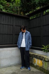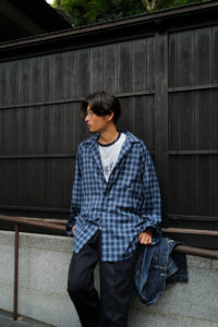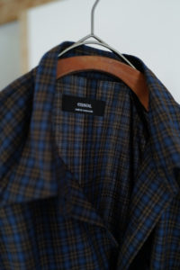 ラグランシャツという時点で珍しいが、シャツにトレンチコートの身幅と袖がくっついたような横広のパターンが最大の特徴。そして1枚でも2枚でもない“3枚袖”を用いて、大きなアームホールからカフスにかけて立体的に仕立てたパターン。これが秀逸で、この内側に色々な服を忍ばせることにもなる。イタリアの老舗が織り上げたSuper120’sの軽量トロピカルウールは、イギリス的ともアメリカ的とも取れる高配色チェック。スーツも仕立てられるこの生地に同調するかのよう、ボタンは水牛を用いたのもミソ。極薄では無いものの、気温変化の大きな日本の四季に対応する。