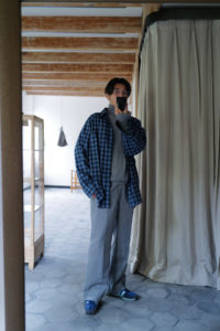 イメージしていた通りビッグサイズ感は打ち消され、大人が楽しめるシャツになった。つるっとして袖通りも抜群なので、トレンチコートのような大きな筒の内側に色々なものが仕舞い込める。ハイゲージニットはもちろん、ミドルゲージも楽勝で、ジャストなGジャンもスポっと袖を通った。これは新しい。僕のようにシャツを豊富に所有している方にこそ、このドレープ感と、このシャツでしか叶わない自由なファッションを楽しんでもらいたい。2色用意しました。Sax Checkはサックスとネイビーの大きめな格子に白のペーン。アメカジチェック的な若々しい雰囲気は、肌艶の無くなってきた大人が着てこそ映える色。寒くなるこれからのシーズン、このチェックがちらっと見えるだけで軽さを出してくれ、色落ちしたデニム、ライトグレーのスラックスなど“冬のライトトーン”とも鉄板の相性です。そしてもう1つは、シックな印象のBlue Brown Check。サックスより暗く、ネイビーより明るいブルー、そこにブラウンが交錯する落ち着いたトーンの細かなチェック。まさに秋冬感のあるウールシャツで、これもデニムには鉄板。ブラウンのトラウザーに合わせたくなりますね。先週リリースしたカシミヤタートルを受注された方、是非合わせてみてください。サイズはMで着丈85、身幅76、裄丈88。Lで着丈87、身幅78、裄丈90。僕(177/68)は、どちらもLを着用。Mも普通に着れますが、袖丈と着丈のバランス的に僕はLの方が良かったです。金土の店頭発売。在庫が残れば日曜正午に商品帖を更新します。