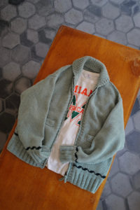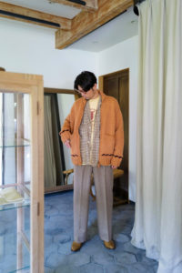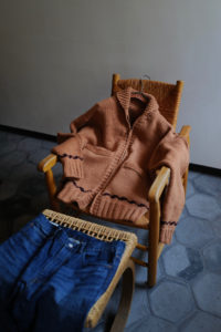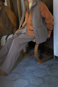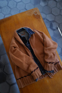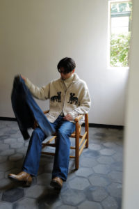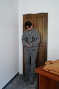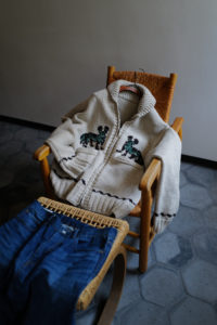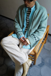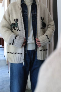 今作もデザインの大枠、サイズバランスなどの設計、細かな仕様のアップデートは<Nikki ESSENTIAL PIECES>の浅川さん、パターンとニッティング、仕上げは<obafer>の小原さんに担当してもらった。人の手でしか得られない味わい深さは、機械編みでは到底出すことが出来ない。おさらいをすると、このアウターニットの作りは家庭機と手編みを組み合わせたものだ。家庭機は横180cm、奥行25cm程の極めて小さなもので、それぞれ手を動かしながら、前身頃、後身頃、両袖、両ポケットなどパーツとして時間をかけて形作り、最後にはプラモデルのように手で繋ぎ合わせてカウチンになる。上記で説明した通り、至るところに手編み、手刺繍を多用している。素材は2種で、2色ずつ用意した。ラムカシミヤは、生後6ヶ月前後のメリノラムを主に、カシミヤを少量ブレンドしたもの。今季は事前に糸加工を加えてリリヤーン化させ、中心が空洞になるため、太い糸ながら軽さを感じられるのが特徴。保温性はピュアカシミヤよりやや劣るが、古いカウチンらしい適度なハリもあり、編み地の表情もクリアにすっきりと仕上がっている。“E.White”はこれぞカウチン的な王道の生成り。“Mint”は冬の重たさを取り払うかのような爽やかな薄い青みの緑、ナイスカラーです。そして、ピュアカシミヤは去年僕も手に入れ、その良さを肌で実感している。お客様の受注の7割がカシミヤだった。内モンゴル産カシミヤ山羊のうぶ毛を使用し、滑りと光沢、保温性、保湿性も文句無し。極細のピュアカシミヤで贅沢に11本取り。くり返しの着用で毛足がふわっと立ってきて、さらに風合いが良くなるのも特徴だ。“Gray”は去年のチャコール系より、少し明るめになった鉄板のミディアムグレー。そして“Coral”はオレンジとベージュの中間的な色で、デニムに抜群。スラックスはカウチンの色に合わせてウールやカシミヤ、ツイードを、インディゴデニムはどの色も良く合います。常に寄り添ってくれる安定感のある“E.White”と“Gray”、他では出会えない特別感のある“Mint”と“Coral”。まだ迷っていますが、僕の今季は“Coral”のリカオンが最有力。今のところ。フレアデニムに合わせて、アメカジ感を中和するように綺麗にレイヤーして着こなしたい気分です。去年も同じこと言った気がしますが、僕的に今季の最高傑作品。是非、この機会をお見逃しなく。今回の販売方法も、受注形式です。金土の店頭受注は、お待ちいただかないように1人づつのご対応となり、40分枠のアポイント制とします。その後、日曜正午より商品帖受注へ移ります。詳しくは下記をお読みください。