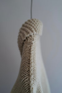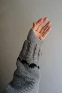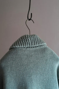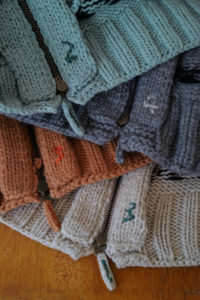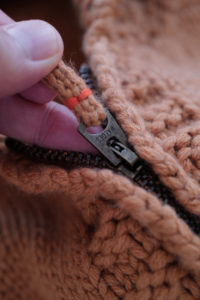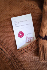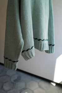 細部の解説。ボディの天竺編みは小型の家庭機で編み立て。腰と袖先に入るウェーブストライプはその上から手刺繍しており、ボコっと立体感がある。襟のガーターは本数取りをボディより1.5倍にしてふっくらと手編みし、逆にポケットの袋布は本数取りを半分にして度詰めすることで、強度を持たせながら内部のもたつきを解消させた。ショルダーラインに走る“引き抜き剥ぎ”は通常は内側に隠れるディテールだが、これを外に出してアクセントに。ここもハンド。クラシックなWALDESのダブルジップの持ち手も1つ1つ手編みで成形。その他、袖付けや袖下の手剥ぎも含めて、小原さんの技術と膨大な時間を費やしてこの1着が完成している。