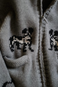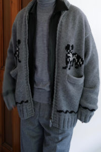<Nikki ESSENTIAL PIECES><obafer>とのトリプルコラボという形で昨年制作したハンドニット。前作の手記はこちら。これを作ったことがきっかけで僕は“新しい冬のカタチ”を手に入れた。冬が短くなったこと。若い頃のように歩いて長時間外に出るという機会が減ったこともあるだろう。車移動が殆どの行動様式にもアウターニットはぴたっとハマった感があった。僕はグレーのカシミヤを作ったこともあり、それだけで保温性も備えているが、“重ねる”を主としたスタイリングに取り入れると長い期間対応出来る。気候と相談してシャツ、ハイゲージニット、スウェット、Gジャン、トラックジャケット、レザーでも何を合わせてもハマる。着心地が良いのでTシャツの上からさっと羽織るのも良く、これは厚手のコートでは叶わないことだ。そして、今作では最も作りたかったニットアウターを作る。カウチンニットだ。あの2人のニットデザイナーと作る“本気のカウチン”は絶対的な価値(勝ち)がある。カウチンニットは元々商業目的でなく、信仰や個人的な思いを込めたお守り的な意味を持っていたそうだ。そうとも知らず、僕が若かりし頃に流行して知ることになったカウチンの大半は動物モチーフ。この制作に取り掛かる少し前、子供と横浜のズーラシア動物園に行った直後で、“オカピ”以上に気になる存在に出会った。それがアフリカに生息する“リカオン”だ。犬とオオカミとハイエナが混ざったような?小柄で可愛いルックスながら、10頭前後からなる“パック”を形成し、集団で20分以上も全速力で獲物を追い回すアフリカの最強ハンター。僕の最大の趣味は格闘技(見る専)だが、命を削った本気の戦いごとにめっぽう弱い。アフリカの肉食動物達の狩猟動画も、ついつい見入ってしまう。圧倒的瞬発力のチーターより、チームワークと持久力の“リカオン”の方が狩猟成功率は格段に高い。この“リカオン”夫婦を小原さんにデザインしてもらい、手刺繍してもらえることになった。これはオプションで付けることができる。