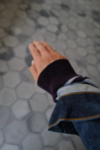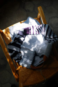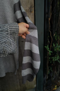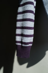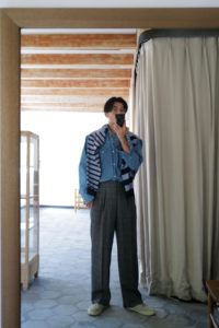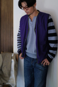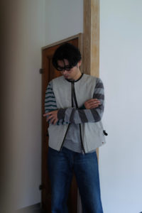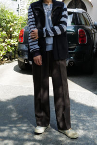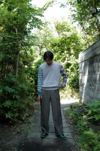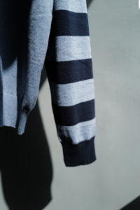 Light Blueの袖はパープルとダークネイビー、Heather Grayにはグリーンとミディアムグレーを選んだ。中に着る時はとにかく汎用性と少しの袖先の違和感、1枚で着るとしっかり個性を発揮するように。そして僕的なおすすめのスタイリングが、肩掛け、タスキ、腰巻き。スタイリング自体に面白みが無い日こそ、このアシンメトリーボーダーをアクセサリーのように使ってみると一気に垢抜ける。