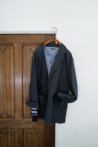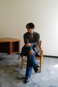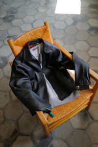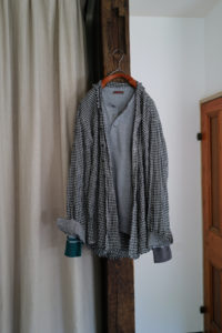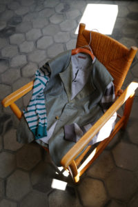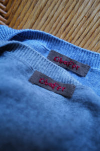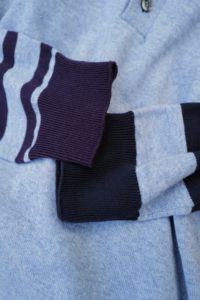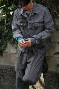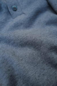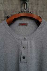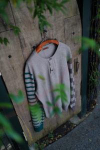 素材はコットンとカシミヤの混紡。落ちカシミヤを使っており、繊維長が通常のカシミヤより短いため毛が吹きやすく、着れば着るほど洗えば洗うほど風合いが増していく。コットンはアメリカ産で、甘撚りのため軽量性に優れている。別注として2色作っておりベースカラーはLight BlueとHeather Gray。中に着た時の見え方をベーシックにしたくて、どちらも杢糸を選んだ。そしてネックは3Bのヘンリー仕様に変更してもらった。ボタンはドレスシャツや装身具に使われる黒蝶貝。まず、ヘンリーニットってだけで洒落感が出るし、中に着ても1枚で着てもニュアンスづいて、ボタンの開け方までその時の気分を反映できるようになる。