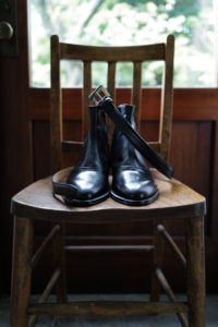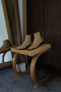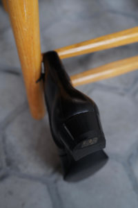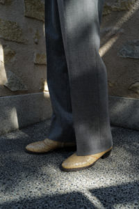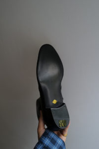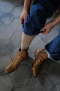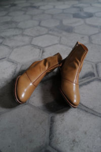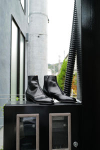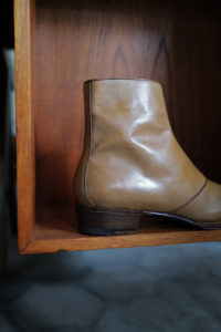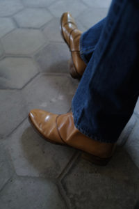 時は1980年代、ユカさんがHermesで購入したブーツを現代に具現化したのがHRMラスト。ウィメンズ応用の木型であり、トゥからシャフトにかけての流れるようなパターンは、その佇まいを眺めるだけでも色気がある。特徴的なT字のセンターシームは伸縮性と強度に優れるカンガルー革の細テープで補強される。ここにサイドジップ、そしてHRMラストを組み合わせたのが柿乃葉モデル“FILETTO”だ。