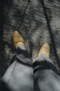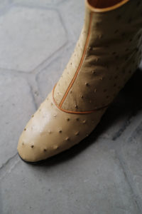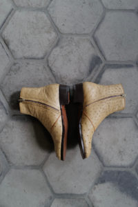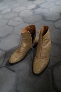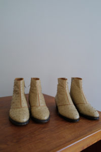 ベージュのオーストリッチ。1枚目が私物。前回受注をして5月に到着、着用は10回ほど。2枚目は右側が新品。ユカさん私物のブーツと同じ革、同じ色。展示会で見るユカさんのオーストリッチのスタイリングが、あまりにも素敵で影響されて作った。どこまでもリッチで個性的なクイルマーク。このブーツを履く時は、下手なことをしなくても良い。何でもないスタイリングの日でも、飛びきりのファッションに格上げしてくれる。オーストリッチの靴は初めて履くことになったが、誰もがその軽さ、柔らかさに衝撃を受けることになる。初日から足に馴染む感覚、ブーツと思えないほどの圧倒的な履き心地。手入れは今のところ、無色のクリームを入れて保湿するのみ。うっすらと小さなシワが入り、ツヤが増してきた。繊細に見えて、砂漠を生きるダチョウ革は耐久性も高い。“自分のとっておき”の靴として、永く永く愛でていきたい。