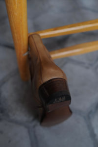 イタリア・トリノの名門ILCEA社、Betis Calfの明るめのキャラメルブラウン。1枚目が私物、前回の受注会に合わせて購入し、着用は10ヶ月で50回ほど。2枚目は右側が新品。フランス産のキメの細かい原皮、クロムながら均一ではないグラデーション感、元々の革のシワなどもある(写真3枚目)。ユカさんに尋ねたところ、薄茶はタンナーにとって最も難しいとのことで、革そのものの個性がそのまま表に出る。色の入り方も全て若干異なり、最も個体差の大きいこの革。僕自身の私物も場所によって深いシワや色のムラ感があり、そこに愛着を持てるアルチザン思考の方にはおすすめ。ご覧の通り、エイジングも素晴らしく、デニムとの抜群に相性の良い色、質感。11月から5月までフレアデニムにこのブーツが鉄板になった。イタリア的な黄色味のあるブラウンと粗野な表情がエロくワイルド。