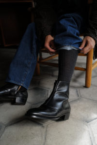 そして、今回作った3足目。去年のFILETTOのお披露目時も「黒があれば」と思っていた方も多いだろう。最近のお客様は知らないかもしれないが、柿乃葉は店主が着たいもの、欲しいものを少数に絞ってリリースしていくエゴショップである。フェードデニム、ライトグレーやベージュのスラックスなど、薄色ボトムが主戦である自分にとって、薄茶ブーツからのスタートが必須だった。でも当然、黒靴も履くし、黒い服を着ることも増えてきた。ここでようやく、最も定番色であろう“黒FILETTO”をリリースするに至った。ご存じ、Hermesの傘下でもあるフランスのDu Puyはカーフ専業タンナー。カーフを知り尽くしたDu Puyが最高級カーフとして扱うのがシャトーブリアンだ。クロム鞣しのボックスカーフの類いであり、肌理細かく美しい銀面を持つのが大きな特徴。キャラメルのBetis Calfと比べると、ややこちらの方がソフト。そして、アルチザンと言うよりは、メゾン的でありエレガントと言うワードが最適。柔らかさがあるということは革の占有面積の多いブーツとの相性は良いし、足馴染みの早さも期待出来るだろう。ファーストブーツの方、是非、黒シャトーブリアンを選択肢のひとつに入れてみてください。サイズ選びに関しては前回と同じことを書きますが、一般的には、Le Yucca’sの定番ラスト“KARENA”よりハーフ上げるくらいが目安。KARENA40でぴったりの方は、HRM40.5。KARENA40で緩さを感じる方は、HRM40で検討といった具合です。一般的なブーツに比べて、シャフトが細めで、踵から足首にかけても寄り添うようなパターンなので、中に多少緩さがあったとしてもフィット感があります。小さくて履くのがしんどいよりかは、緩いなら靴下の厚さや、インソールでの調整がおすすめです。なので、2つのサイズで迷ったら上で良いんじゃないかと思います。同じHRMラストのDress Westernと比べると、サイドジップもあるので脱着はかなり楽です。上記はあくまで、基本的な考えです。骨格は人それぞれなので、フィッティング出来る方は是非、鎌倉に来てください。今週の金土、アポイント制での受注会となります。また、KAKINOHAHANAREには金曜より、写真でも履いているPantherellaのホーズ類も入荷します。耐久性も高く、FILETTOとの合わせにも最適です。宜しくお願いします。