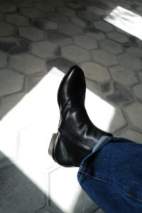 踵を立体的に包むこむヒール部から、ブーツとしては華奢なシャフト、やや高めのヒールを持つHRMラスト。フロントだけでなく、バックシャンまで美しいプロポーションは最大の特徴だが、裁断、ハンマー、釣り込み、すくい縫いに至るまで90%を手作業に頼るイタリアの名門、Enzo Bonafeが作る靴の履き心地と馴染みの良さを、さらに思い知らされる1足になった。加えてブーツのストレスになり得る“脱着性”も容易なこと、フレアを履く機会が多いことも手伝って、購入してからFILETTOばかり履くことになった。このブーツを履くとより裾が綺麗に落ちてスタイルが格段に良く見える。やっぱり“ファッションは足元”という決まり文句を、改めて気づくことになるブーツだと思う。