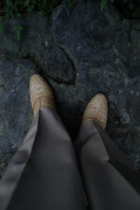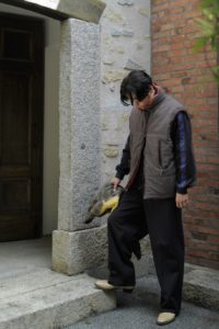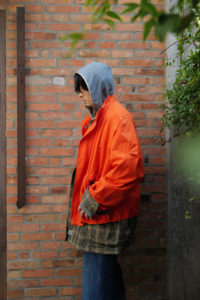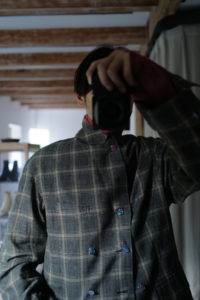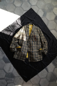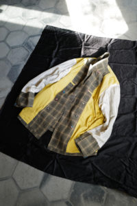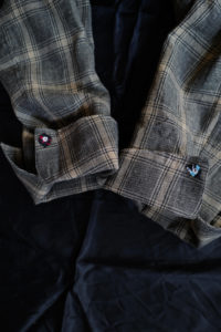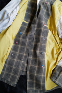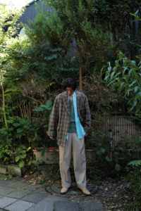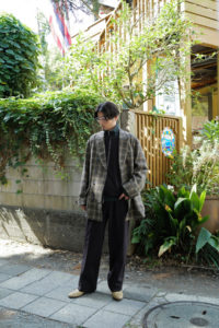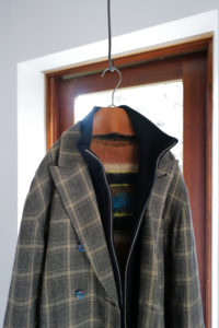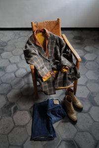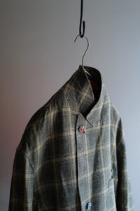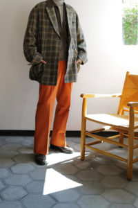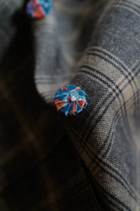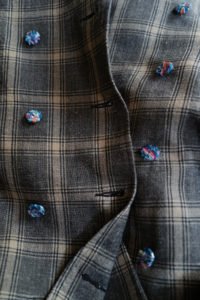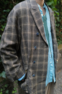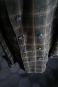 トスカーナのLyria社の生地はテキスタイルデザイナーであるRiccard Bruni氏によって手掛けられる。「感情をデザインする」「日本の侘び寂びの哲学」を生地作りのテーマとするLyriaは、天然有機素材を重視すること、自然由来の染料を用いることに重きを置き、粗さや不完全さを織物に取り入れ、見事なまでの風合いと奥行きを持った生地を作る。同氏が作ったこのリネンウールを見て触って、一気に心を持っていかれてしまった。ウールのウォーム感や柔かさを奥に潜ませ、リネン特有のハリや粗野感をしっかり残し肉厚に織り上げた、ベージュとグレーが交錯するボケ味チェック。着込んでいった先の経年美化を妄想してしまい、生地フリーク達を唸らせるものだと思う。そこに、古いスカーフを細くカットして包んだ赤羽さん自作のくるみボタン。その対となる、古い絨毯から作った裏ボタンもしっかり装備。RIccardの生地と組み合わさった時の圧倒的なパワー、着る喜びに包まれる服である。