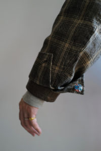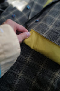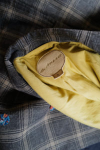 裏地やフラップ裏には、25AWのBLACKBIRDのコレクションで使われているコットンシルクのシャツ生地を使わせてもらった。Cut Off Collar Shirtで使用されている。渋みのあるマスタードイエローが、ポケットに手を突っ込んだ時や、ジャケットを脱いだ時もしっかり際立つ。袖裏のストライプはお約束のキュプラ。インにスエードやGジャンなど摩擦のあるジャケットを仕込む時もするっと袖通りが良い。ネームは本革。