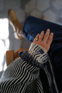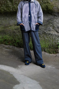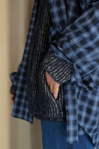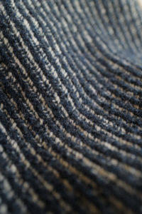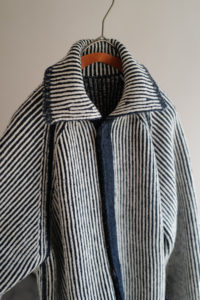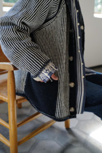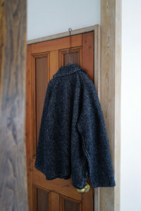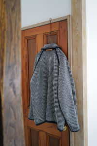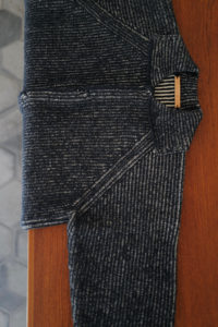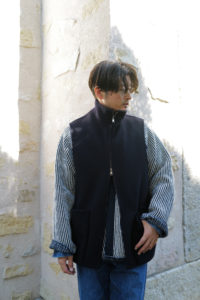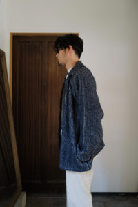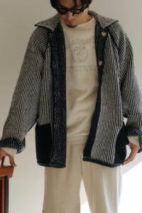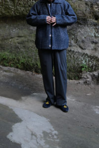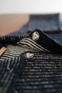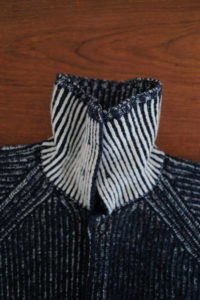 Navy×Whiteのリバーシブルを作成。デニムはインディゴ糸と白糸で作られているから、組み合わせとしては全く同じ考えだ。Whiteは去年インラインと同一のシェットランドウールに決定。Navyは糸から変更し、今作ではモール糸を使用している。太い糸に細い糸を巻きつけ、その細い糸をカットしながら毛羽を出していく。パイル調となった糸表面は、ふかふかとした柔らかな肌触り、さらに軽さが出たのも嬉しい限りだ。Navy面はシームポケット、White面はパッチポケットとなり、どちらともパイル状のモール糸で包まれているから、ずっと手を突っ込んでおきたくなる。