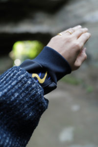 SNAFUのデザインとは。両面共に比翼仕立てで、スナップボタンが隠れている。ほっこりした雰囲気になり易いこの手のアウターニットだが、すっきりとシャープに仕上がっているのは、このせいだ。そして特徴的な袖。“やっこ袖”と言うべきか、肩から直線のパターン。そのアームホールはかなり広く、さらにニット特有の伸縮もあるので、ジャケットやブルゾンなどがこの内側にスポッと入ってしまう。