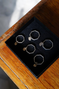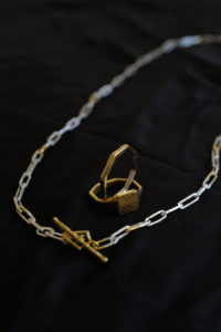 1年半前に作ってもらった私物のリング。片方は妻が所有。白金と表現されるプラチナは、シルバーと比較すると反射率が低く渋みがあり、色味が深い。さらに密度は約2倍と言われ、硬度が高くずっしりと重厚感があって所有欲に満たされる。今回のPT999=純プラチナは硬さの中に粘度があり、手仕事による鍛金を繰り返すことで、味わいのあるプラチナの表情が生まれる。一方、純金はより柔らかい素材であり、この全く異なる性質を持つ“純プラチナ+純金”を融合させることは極めて難しい。本池さんだからこそ成し得る技である。来年から、純金を用いた特別な商品にのみ、グレーの桐箱の内側がファー仕様に変わる。ブランドロゴも新しい仕様に。