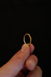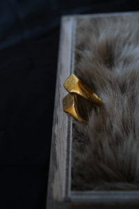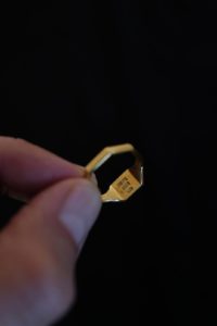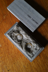 1年半前に作ってもらった私物のリング。片方は妻が所有。白金と表現されるプラチナは、シルバーと比較すると反射率が低く渋みがあり、色味が深い。さらに密度は約2倍と言われ、硬度が高くずっしりと重厚感があって所有欲に満たされる。今回のPT999=純プラチナは硬さの中に粘度があり、手仕事による鍛金を繰り返すことで、味わいのあるプラチナの表情が生まれる。一方、純金はより柔らかい素材であり、この全く異なる性質を持つ“純プラチナ+純金”を融合させることは極めて難しい。本池さんだからこそ成し得る技である。来年から、純金を用いた特別な商品にのみ、グレーの桐箱の内側がファー仕様に変わる。ブランドロゴも新しい仕様に。