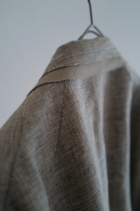 4年前、ensou.の西川さん談。周知の通り、本格的なテーラードジャケットは表地と裏地の選定だけでなく、その内部に隠れた毛芯、パット、カラークロスなどの副資材、複数のミシン、手刺し、アイロンワークなどを駆使して、体を立体的に包むように構築される。基礎や骨組みがしっかり整った上で完成し得る、言わば建築的な服である。そんな本格的なテーラードをデザイン、パターニング、裁断、縫製に至るまで自らの手で完結出来る西川さんが、あえて制作途中で止めてしまったような、作りかけジャケットが“SAL2” だ。過去に別注として作らせてもらった“SAL2” Linen Sand Beigeは、約4年の月日を経てくったりと僕好みの何とも言えない風貌にまで育った。いかんせんTシャツに着ることが多かったので、もっとジャストに着たくなって手洗いは3度。思いのほか縮みはなかったが、生地のハリが収まり馴染んだことで、結果として望んだ方向になった。着用、洗濯を経てエッジは砕け、“ハ刺し”ステッチはほつれ、副資材はしっかり外に露出し、腕には深いしわが形成。着るうちに余計に愛着が増し、私物のシングルテーラードの中でも最も愛すべきジャケットになった。アトリエメイドの手間と時間のかかるジャケットで、当時多くの数量が作れなかったこともあり、沢山の方に再販の声をいただいた。アルチザン好きのお客様が多い。だが、英国のこのユニークなリネン生地は既に廃盤。英国で再生産されていないか、類似のものは存在しないか、定期的に西川さんには相談していたが、どうやってもリクエストには応えることができなかった。そして、一通のLINEが届いたのが今年の6月のこと。一気に風向きが変わることになる。