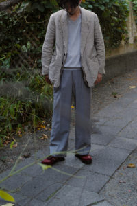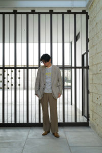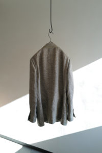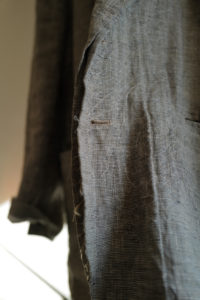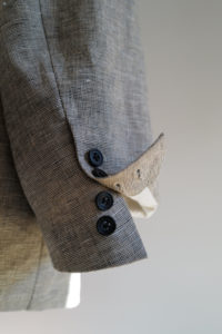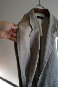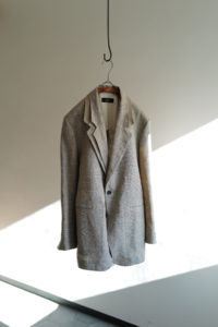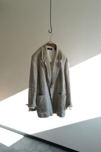 4年前、ensou.の西川さん談。周知の通り、本格的なテーラードジャケットは表地と裏地の選定だけでなく、その内部に隠れた毛芯、パット、カラークロスなどの副資材、複数のミシン、手刺し、アイロンワークなどを駆使して、体を立体的に包むように構築される。基礎や骨組みがしっかり整った上で完成し得る、言わば建築的な服である。そんな本格的なテーラードをデザイン、パターニング、裁断、縫製に至るまで自らの手で完結出来る西川さんが、あえて制作途中で止めてしまったような、作りかけジャケットが“SAL2” だ。過去に別注として作らせてもらった“SAL2” Linen Sand Beigeは、約4年の月日を経てくったりと僕好みの何とも言えない風貌にまで育った。いかんせんTシャツに着ることが多かったので、もっとジャストに着たくなって手洗いは3度。思いのほか縮みはなかったが、生地のハリが収まり馴染んだことで、結果として望んだ方向になった。着用、洗濯を経てエッジは砕け、“ハ刺し”ステッチはほつれ、副資材はしっかり外に露出し、腕には深いしわが形成。着るうちに余計に愛着が増し、私物のシングルテーラードの中でも最も愛すべきジャケットになった。アトリエメイドの手間と時間のかかるジャケットで、当時多くの数量が作れなかったこともあり、沢山の方に再販の声をいただいた。アルチザン好きのお客様が多い。だが、英国のこのユニークなリネン生地は既に廃盤。英国で再生産されていないか、類似のものは存在しないか、定期的に西川さんには相談していたが、どうやってもリクエストには応えることができなかった。そして、一通のLINEが届いたのが今年の6月のこと。一気に風向きが変わることになる。