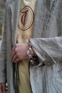 “SAL2”最大の特徴である、未縫製箇所の多いエッジ。通常目にすることはない副資材が外に露出。偶然なのか狙いなのか、それらがベージュアイボリー系のグラデーションとなり、デザインとして美しく成立している。さらに胸から腰にかけては、生地の上から白ステッチがうっすら見える。本格的なジャケットは、生地と芯地を緩めに固定するため、特殊ミシンを用いて“ハ刺し”ステッチを施す。そんな内部に隠れて見ることが出来ない“ハ刺し”を外装にデザインとして取り入れた、ensou.の掟破りな遊び。このステッチが次第にほつれていくサマが、また堪らなく気分を上げてくれる。