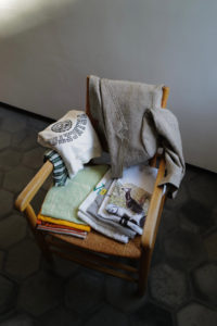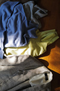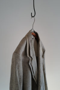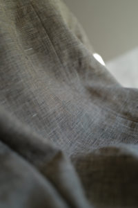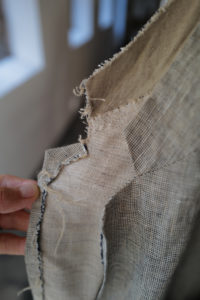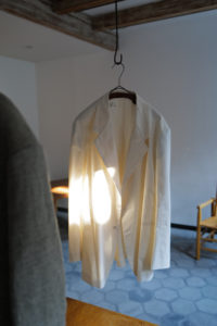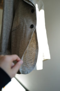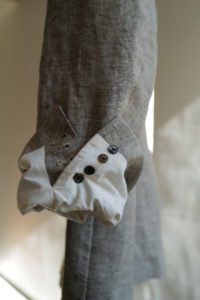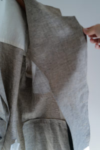 LINEを開くと、あの生地の画像が映っている。試織してみたら、予想以上に上手くいったとのこと。なんと、廃盤になった英国リネンの生地端を解体、糸レベルまで掘り下げ、色、リネンの節、ネップや番手差まで、国内の生地屋と一緒に忠実にリプロダクトしたというサプライズだった。白、ベージュ、モスグリーン系グレーの3つのリネン糸で構成。引きではグレー味のあるベージュ、寄りで見ると3色それぞれの糸の太さも異なるのがわかる。強めのネップ、荒々しさのあるリネン特有の不均一さを持ったユニークな生地は、さらに個性的に育っていく。
