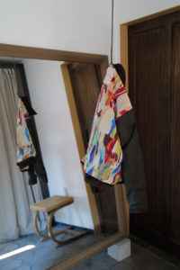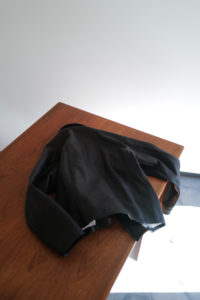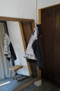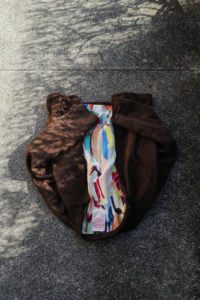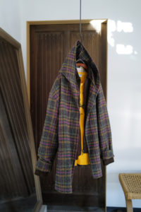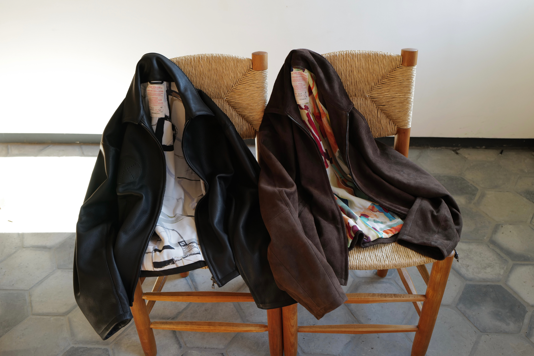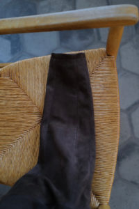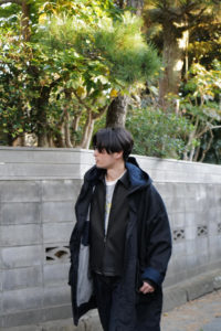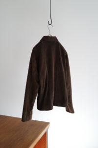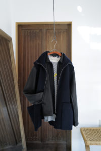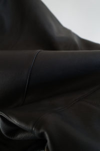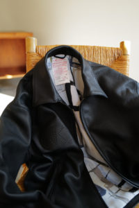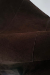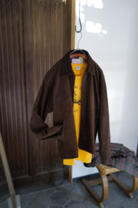 他の革にはないバネのような柔軟性、人肌に近いしっとり感に魅了されてしまうオイルディア。VILLEに最も相性の良いのが“鹿革”だと、自ら着用して実感している。2年前に出したブラックと同クオリティの革だが、今季のものはより吸いつくような極上感がある。そして、初のお目見えとなるディアスエードのチョコレートカラー。こちらもオイルをたっぷり含み、しっとりトロトロな質感。ミニマムなデザインに相反するように、内側はとことん攻めている。今作も裏地には、ハンドドローイングの抽象画プリントを載せたキュプラレーヨン。さっと脱いでハンガーにかける時でさえVILLEは、気分を上げてくれる。