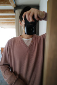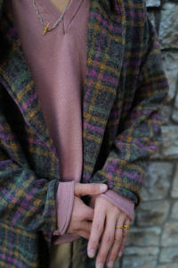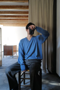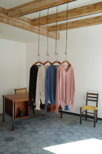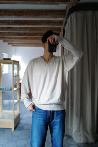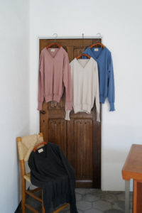 2度にわたってオリジナルでSmooth Turtle Knitを作っているが、柿乃葉の隠れたヒット作である。前作は名だたるブランドを顧客にもつイタリアメーカーのカシミヤを使用した。買っていただいた方の着用率も異常に高く、受注会形式だったので、もう1色買っとけば良かったとの声が多く本当に作って良かった。今作を作るにあたっても力を貸してもらっているNikki ESSENTIAL PIECESのデザイナー浅川さんも好んで着てくれているそうだ。ハイゲージの部類ではあるが、ネックに沿い首を温めるというタートルという性格もあって、真冬でも十分な保温性だということがわかった。一方、薄着派で暑がりな僕にとっては、気温が下がり切るまでの間は、肩かけやマフラー代わりとして使うことも多かった。日課のサウナのせいで代謝が良いのもあるだろうが、常食のベトナミーを食べていると汗が吹き出る始末(苦笑)。同じような肌に近い使い方が出来て、しっかり寒い日はカシミヤタートル、日中気温が上がる日はこっちという具合に、選択肢があると尚良いと思った。最近、シャツの下にVニットを着ることがさらに増えた。適度に肌の露出があって、シャツの下に着た時のシャープさと抜け感が良いのだ。kakinohaオリジナルとして“シャツの内側に着るVニット”を作るチャンスが訪れた。かと言って今回作るものは、ぴたっとなるインナー専用でなく、1枚で着る時こそかっこつくものにしなくてはならない。すぐに浅川さんに相談。素材はもう決まっていた。タートルを作る時にも候補に上がっていた素材であり、同じイタリアのサプライヤーが作っているカシミヤ70シルク30。稚拙な表現だが、抜群に気持ちいい。色出しも繊細で、ここんちしか出せないニュアンスカラーが揃い、各メゾンでは同素材のハイゲージニットで30万、40万といった具合だ。これに勝てるものはそうそう無いと思う。