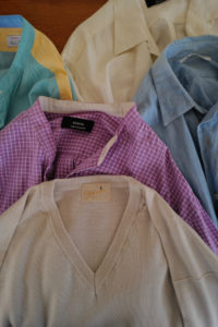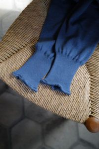 薄ブルーのAqua。タートルのLight Blueと比較すると、より青み、グレーみがあります。当初、Aqua Grayという名前で動いてましたが、グレーを強く連想させてしまうのも違うかと思い、Aquaとしました。ネイビーより華やかな印象で、差し色の要素も十分果たすのに、暖色や寒色問わず合わせられる色が多いので、使い勝手にも優れるこの色。チャコールの差し色にしたり、デニムやシャンブレーと馴染ませるように合わせるのが好き。ライトブルーのシャツと同様、ライトブルーのニットは美しい。男のライトブルーは歳を重ねて白髪が見えてきてこそ、品良く映ります。