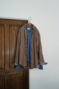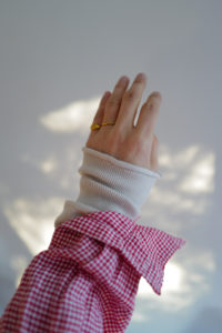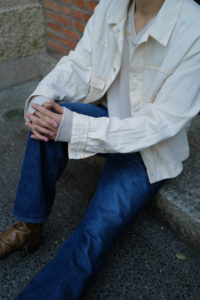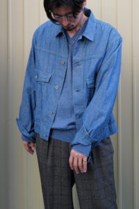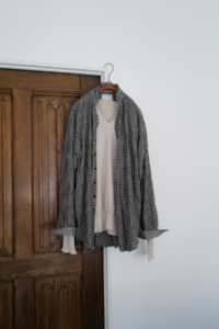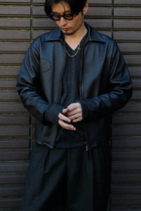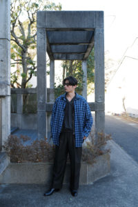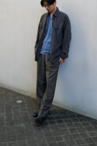 まず、肝となるVの見え方をどうするか。Vニットはここの顔作りで8割がキマる。僕は浅すぎるVを着るくらいなら、クルーを着たい派。Vはやっぱり抜け感があって、大人っぽいから好きだ。かと言って、深すぎると色っぽくなるし、首元のレイヤーが難しくなって着る頻度が落ちてくる。天幅もかなり重要だ。狭すぎるとシャツなどを羽織った時に首元の抜け感が損なわれるし、広いと同じく中に着るカットソー問題に困る。1枚で着る時、上に重ねる時のどちらも考慮し、美しく見えて、心地良くて大人っぽい最適な“下がり”と“天幅”のバランスを慎重に探っていった。これまでの浅川さんの経験にも助けられて、ミリ単位で試作と修正を重ねて、完成度の高い“Vの造形”が作れたと思う。Vの中には何を着るか。僕は今は素肌っぽく着たい気分なので、深めのタンクトップかUネックのカットソーを合わせる。気分を変えたかったりカジュアルに着たい日は白T(リブは細い方がきれい)をレイヤーしても良いし、BLACKBIRDのメッシュタンクも新鮮な見え方をする。シャツに合わせた時の見え方も、満足いく仕上がりになった。