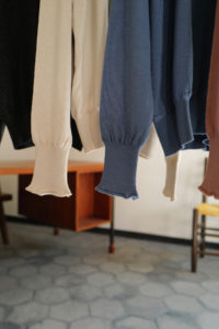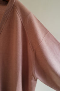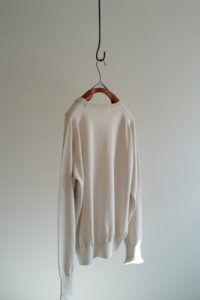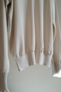 ディテール解説。Vの開きの考えは先述の通り。Smooth Turtleをベースに作っていくが、着丈は同一、シルエットはさらにリラクシーに。リブとカフはきゅっと締め、腰も袖もだるっと溜まるような設計。腰位置を好きなところで止められるので、身長や体型問わず、幅広く方にマッチする。ハイゲージでドレープもあるので、かなりジャストなシャツの下でない限り、着にくさは無いはずだ。肩線の後ろ側に回り込む“肩べらし”をフロント側にも配し、さらに肩の先端部分にタックを入れ、ラインを引くことでラグランとセットインが同居したような唯一無二な見え方に。各リブの付け根の5本ガーターも継承。Vでシャープに見える分、袖先は“Vスリット”ではなく、くるくるの“ロール仕様”でよりラフにした。いつだってカフレイヤーが楽しい。