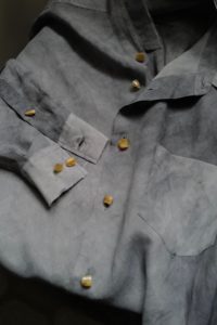 青みがかったグレーのFade Gray。 前作のアップデートとなる“コールドダイ”は、ビスコース50にシルク50を交織した極上素材。前作のトロみに、シルクの繊細な光沢が混ざり合い、陰影にえも言われぬ毒っ気まで宿っている。光を吸い込み、影を美しく溜める Lyliaの魔法とも言えるこの絶妙なニュアンスカラーは、個体差と言っていいのか、1点ものと言っていいのか、写真の通りそれぞれの濃度やムラ感まで全く異なる。雲や霧のような暗がり、静かな色調に呼応するかのような、イエローアゲートのボタン。鈍く光る天然石の表情が、生地の透明感や奥行きをさらに引き立てている。10年後、生地がクタクタになり、色がさらに枯れた時、このシャツはどんな表情を見せてくれるのか。着る人の生き様まで透けるような1着になるはずだ。