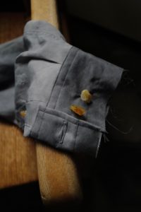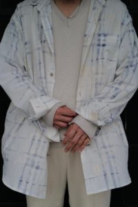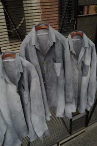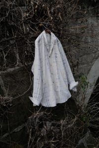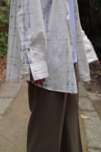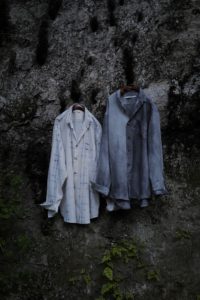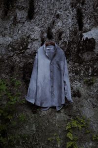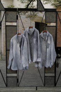 昨夏、世に放ったANSNAMとの共作、通称“ネイチャーシャツ”。イタリア・リリア社ならではのコールドダイのムラ染めシャツは、“不完全な美”という名の劇薬を教えてくれた。僕自身も前作は2色とも手に入れ、沢山袖を通してきたからこそ、このシャツの持つ異質さ、他とは全く別ものの高揚感があることを肌身で理解している。ひょうひょうと服に狂気を込める中野さんと再び向き合い、第2弾を企画するに至った。ANSNAMのアトリエにはいつも魅力的な生地が並んでおり、ものの数分で2つの生地をPICKすることになった。引き続き、Lyliaのものだ。中野さんに聞く前にこれはLyliaだとわかる。ここんちは単なる生地屋ではない。トスカーナの地で、“日本の侘び寂び”をテーマに掲げ、最新の技術と職人の手仕事をマッシュアップさせる稀有な表現者と言える。今作は、前作をも凌駕する“静寂のビスコースシルク”と“衝動のハンドペイント”という2つの異なる個性を創出。再びあの“チョップ”のディテールに落とし込んだ。